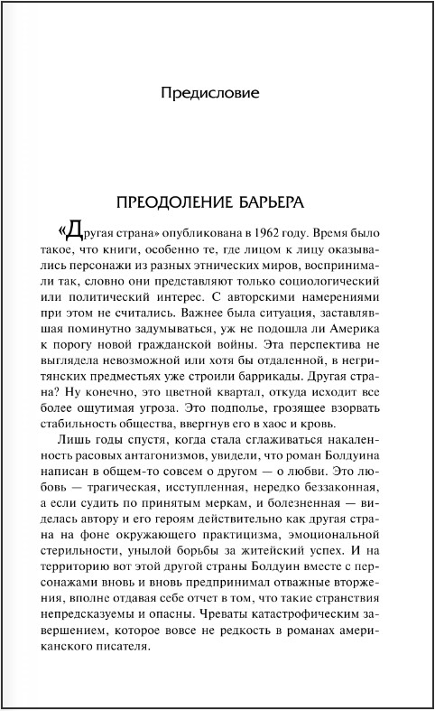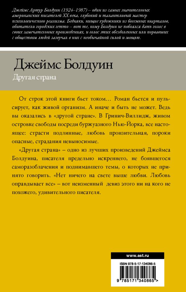 «Другая страна» – одно из лучших произведений Джеймса Болдуина, писателя предельно искреннего, не боявшегося саморазоблачения и поднимавшего темы, о которых не принято говорить. «Нет ничего на свете выше любви. Любовь оправдывает все» – вот неизменный девиз этого ни на кого ни похожего, удивительного писателя..