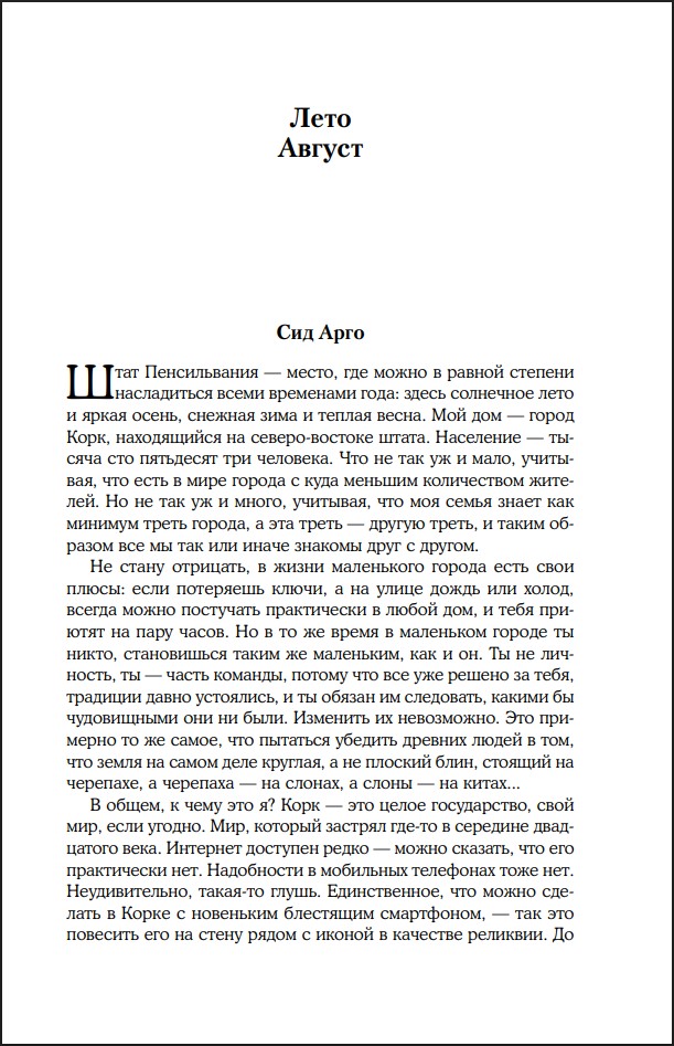 Меня зовут Сид Арго. Мой дом – город Корк, один из самых консервативных и религиозных в штате Пенсильвания. У нас есть своеобразная Библия (её называют Уставом), открыв которую, на первых ста пятидесяти страницах вы увидите свод правил, включающий обязательность молитв, служб и запреты.