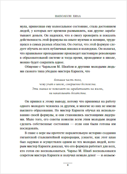 Более 80 лет «Думай и богатей» по праву считается самым уважаемым учебником в мире по достижению успеха, преодолению трудностей и повышению жизненной энергии. В нем автор утверждает: «Бедность – это состояние ума. Успех приходит к тем, кто мыслит категориями успеха». Книг основана на более, чем 500 интервью с самыми состоятельными людьми Америки. На протяжении десятилетий "Думай и богатей" занимает первые строчки мировых рейтингов среди книг по обретению богатства и входит в топ-7 самых влиятельных бизнес-бестселлеров всех времен.