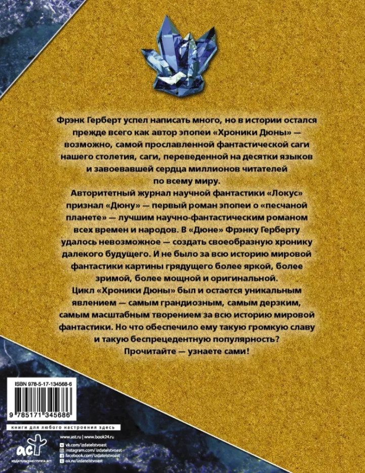 Авторитетный журнал научной фантастики «Локус» признал «Дюну» – первый роман эпопеи о «песчаной планете» – лучшим научно-фантастическим романом всех времен и народов. В «Дюне»м Фрэнку Герберту удалось невозможное – создать своеобразную хронику далекого будущего. И не было за всю историю мировой фантастики картины грядущего более яркой, более зримой, более мощной и оригинальной.