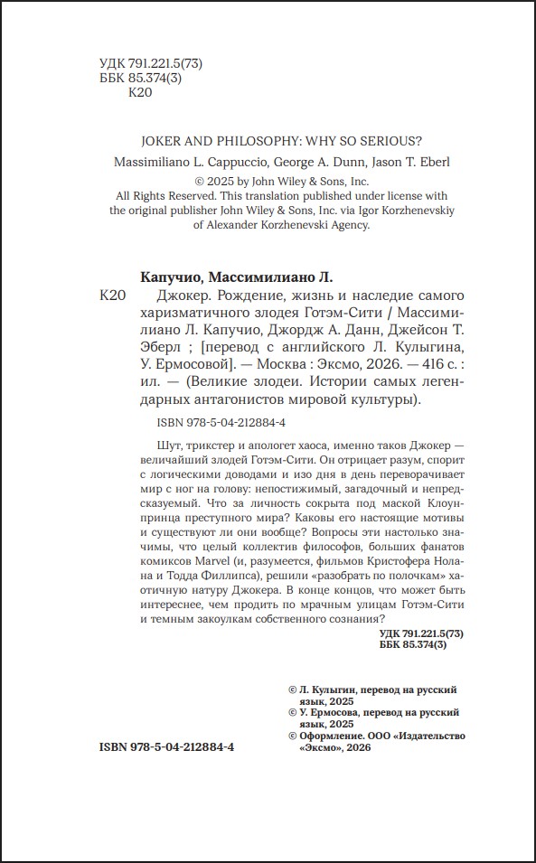 Путешествуя по мрачным улицам Готэм-Сити и еще более мрачным закоулкам человеческого разума, авторы, в рядах которых ведущие философы, преподаватели университетов США и Европы и большие поклонники комиксов Marvel (и, разумеется, фильмов Кристофера Нолана и Тодда Филлипса), подробнее расскажут о культовом антагонисте: