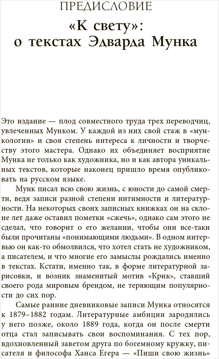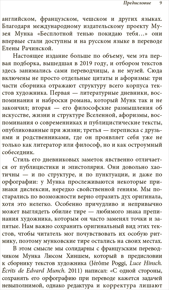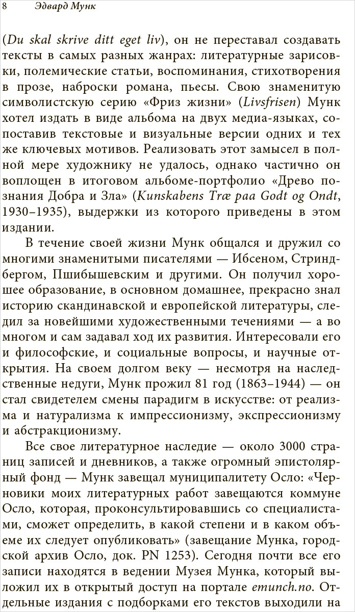 У этой серии имеется параллельное воплощение в виде литературных текстов, подборка из которых опубликована в настоящем издании. Мунк – не только один из самых узнаваемых художников своего времени, но и автор уникальных текстов: литературных дневников, воспоминаний, неоконченного романа, философских размышлений о жизни и искусстве, афоризмов и публицистических текстов, а также огромного количества писем, соответствующего его широкому кругу общения.