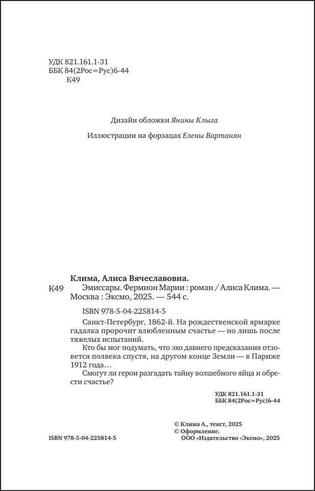 Оставить отзывСанкт-Петербург, 1862-й. На рождественской ярмарке гадалка пророчит влюбленным счастье – но лишь после тяжелых испытаний. Спустя полвека, в Париже 1912-го, давнее предсказание отзывается в судьбах совсем других людей... Смогут ли они разгадать тайну волшебного яйца и обрести счастье?