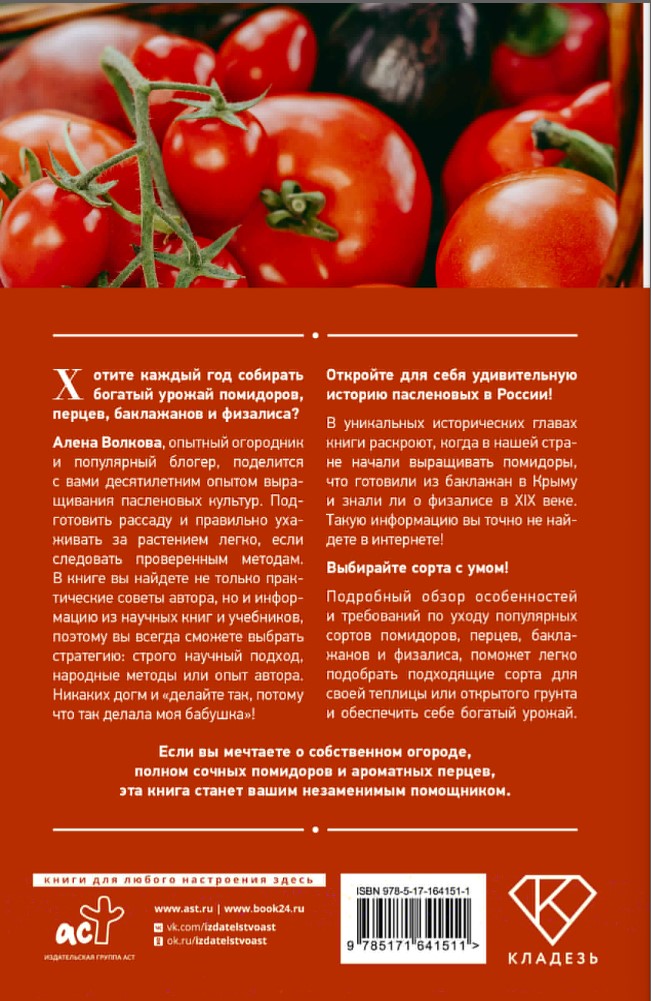 Оставить отзывХотите каждый год собирать богатый урожай помидоров, перцев, баклажанов и физалиса? Эта книга станет вашим надежным помощником в этом деле!