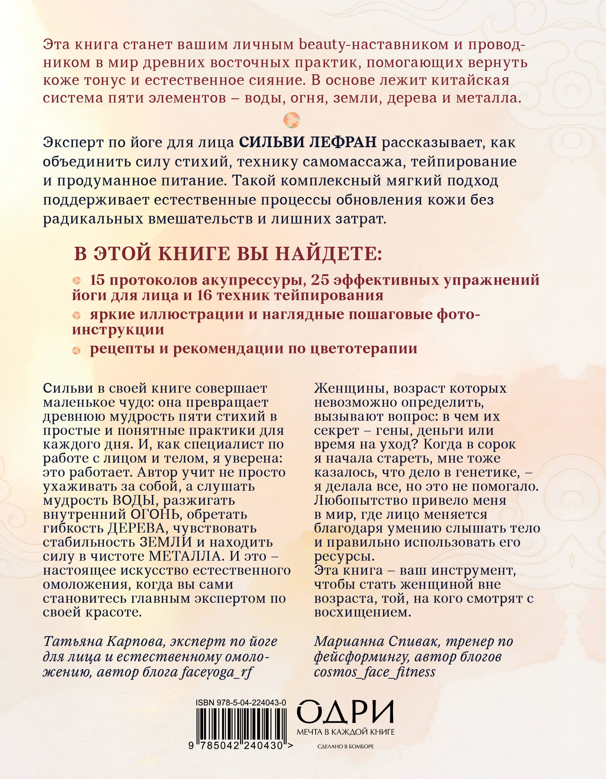 Оставить отзывЭто практическое руководство по естественному омоложению кожи, вдохновленное китайской системой пяти элементов. Эксперт по йоге для лица и тейпированию Сильви Лефран объединяет древнюю восточную мудрость и современные beauty-методы, чтобы пробудить природную энергию красоты.