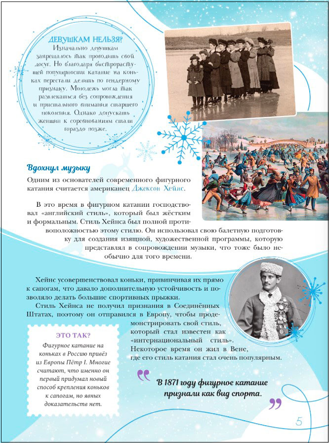 Из книги можно узнать и про историю фигурного катания, о видах и правилах фигурного катания, снаряжении фигуриста, костюмах и аксессуарах, музыкальном сопровождении выступления фигуристов.