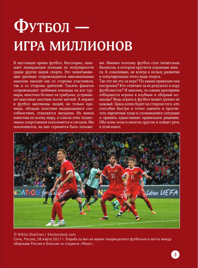Футбол – спорт номер один в мире. Миллионы болельщиков с трибун стадионов и у экранов телевизоров с азартом следят за отборочными турами континентальных и мировых чемпионатов, а потом за встречами команд в финале. Этот популярнейший вид спорта – целое искусство, он стал неотъемлемым элементом культуры, определяющим стиль жизни людей в разных уголках нашей планеты.