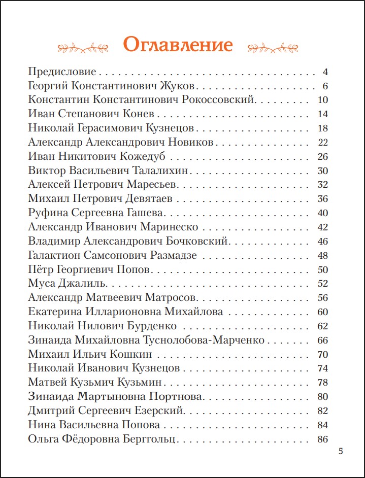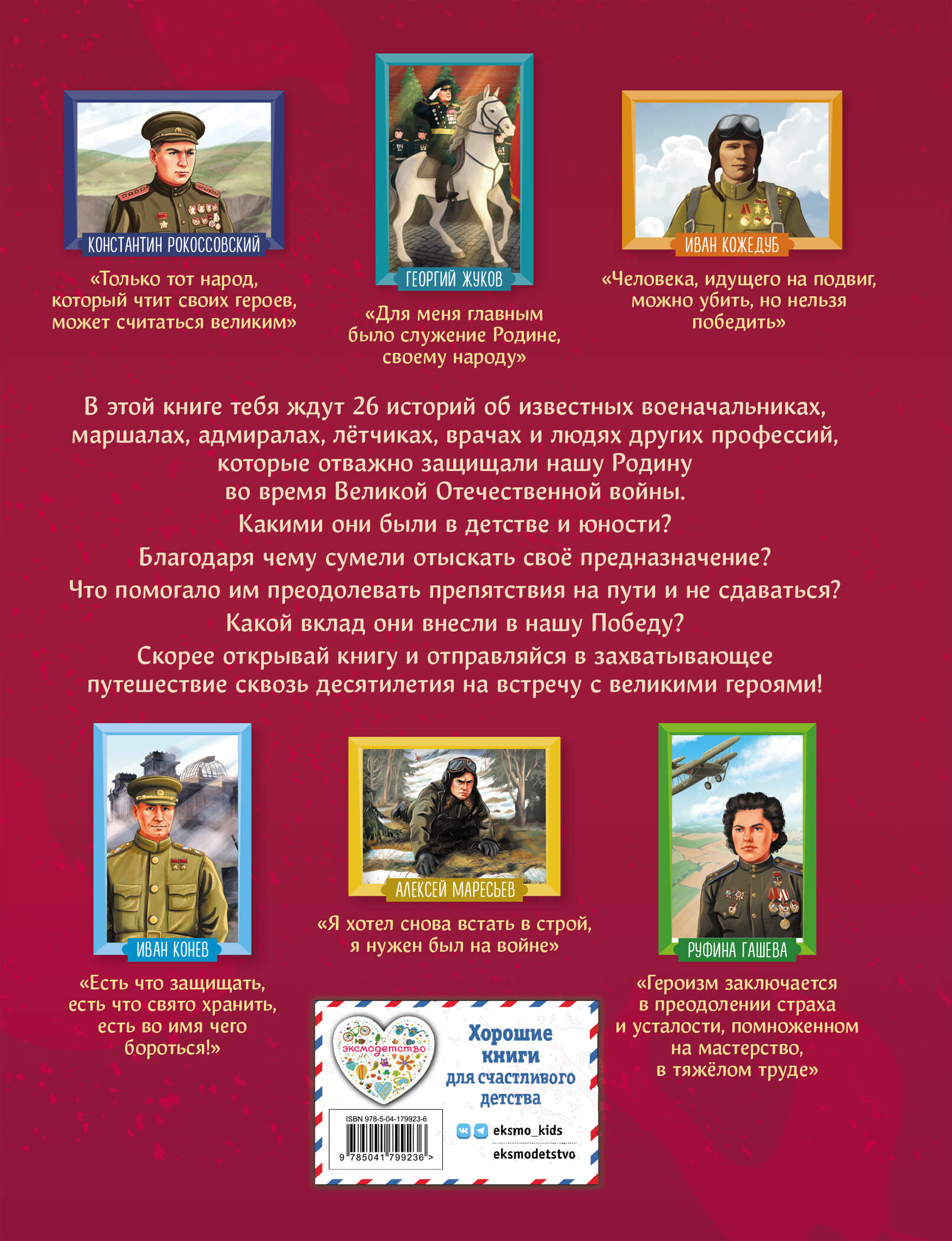 В сборник включены рассказы о Маршале Победы – Георгии Жукове, маршалах Иване Коневе и Константине Рокоссовском, главкоме ВМФ Николае Кузнецове, лётчике-асе Иване Кожедубе, создателе танка Т-34 Михаиле Кошкине, главном хирурге Красной Армии Николае Бурденко, а также о менее известных героях, от медсестры З. Туснолобовой, вынесшей с поля боя более 120 раненых, до Александра Матросова, закрывшего грудью вражеский дзот.