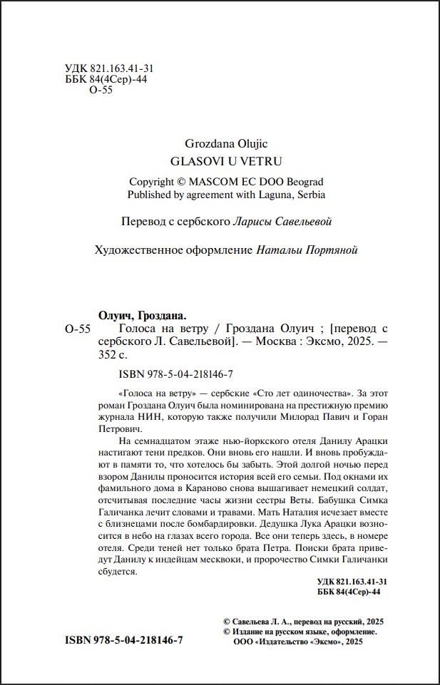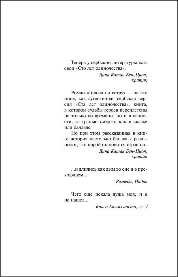 Оставить отзыв«Голоса на ветру» – сербские «Сто лет одиночества». За этот роман Гроздана Олуич была номинирована на престижную премию журнала НИН, которую также получили Милорад Павич и Горан Петрович.