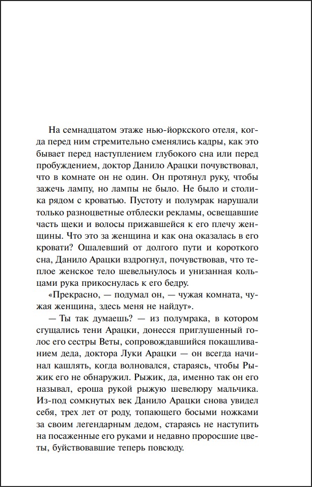 На семнадцатом этаже нью-йоркского отеля Данилу Арацки настигают тени предков. Они вновь его нашли. И вновь пробуждают в памяти то, что хотелось забыть. Этой долгой ночью перед взором Данилы проносится история всей его семьи.