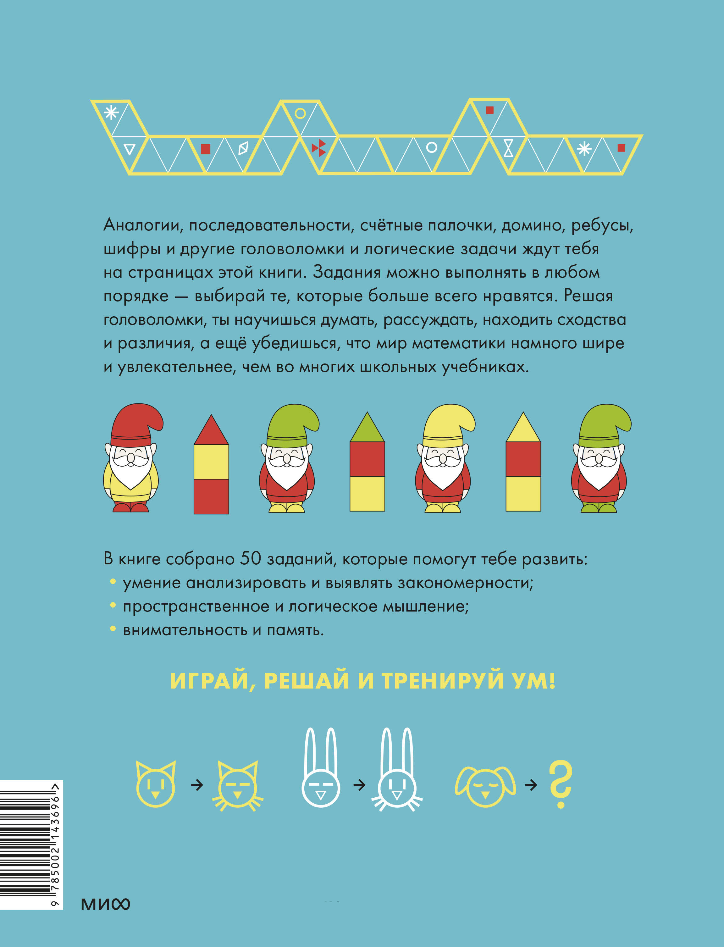 Развивающая тетрадь с визуальными головоломками и логическими задачами от автора популярной методики «Мышематика». Аналогии, последовательности, орнаменты, геометрические фигуры, счетные палочки, домино, ребусы, кубики, шифры, графические примеры – все задания в сборнике не требуют вычислений. Выполнять их можно в любом порядке, выбирая те, которые больше всего нравятся. Решая головоломки, дети научатся думать, рассуждать, анализировать и находить закономерности, а также будут развивать внимательность, сообразительность, способность воспринимать мир в многомерном формате. А это, в свою очередь, поможет им эффективнее учиться в школе и увереннее чувствовать себя в любой ситуации.