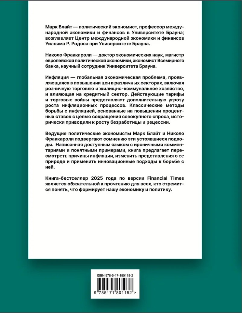 Ведущие политические экономисты Марк Блайт и Николо Фраккароли подвергают сомнению эти устоявшиеся подходы. Написанная доступным языком с ироничными комментариями и понятными примерами, книга предлагает пересмотреть причины инфляции, изменить представления о ее природе и применить инновационные подходы к борьбе с ней.