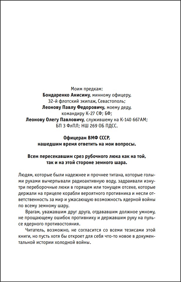 А еще она посвящена людям, которые были надежнее и прочнее титана. Которые голыми руками вычерпывали радиоактивную воду, задраивали изнутри переборочные люки в горящем или тонущем отсеке. Которые держали на прицеле корабли вероятного противника и несли на своих плечах ужасающую ответственность за жизнь миллионов.