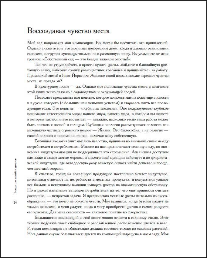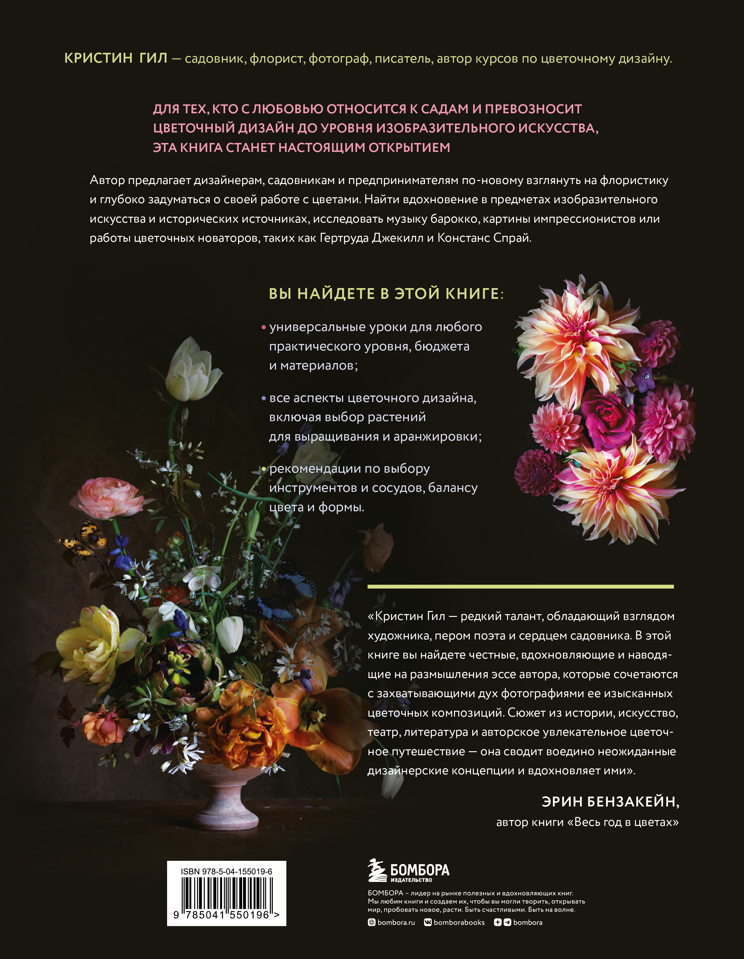 Эта книга для тех, кто видит во флористике не только ремесло, но и настоящее искусство. Те, кто по-настоящему видит в создании цветочных композиций вдохновение, творческий процесс, высокое искусство, непременно оценит уникальность работы автора. Вы по-новому взглянете на флористику и поймете, как находить новые идеи и смыслы в предметах изобразительного искусства и исторических источниках. Автор рассказывает, как музыка барокко, картины импрессионистов или работы цветочных новаторов, таких как Гертруда Джекилл и Констанс Спрай, способны повлиять на креативность при составлении букета. В этой книге вы познакомитесь с уникальными темами: от теории цвета и цветочного дизайна, отражающего стили искусства на протяжении веков, до этики сбора растений для различных композиций и их фотографирования.