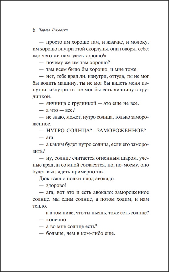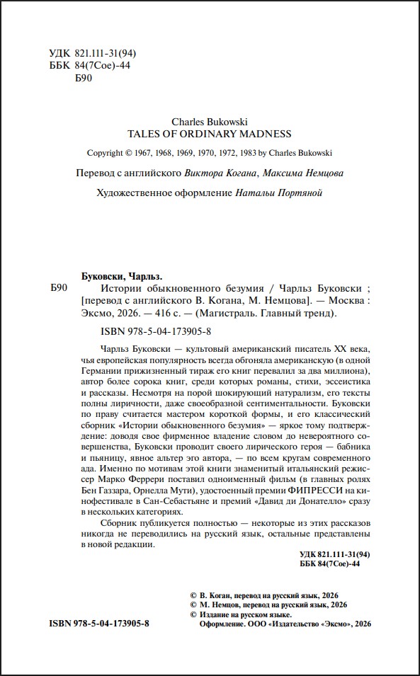 Буковски по праву считается мастером короткой формы, и его классический сборник «Истории обыкновенного безумия» – яркое тому подтверждение: доводя свое фирменное владение словом до невероятного совершенства, Буковски проводит своего лирического героя – бабника и пьяницу, явное альтер эго автора – по всем кругам современного ада.