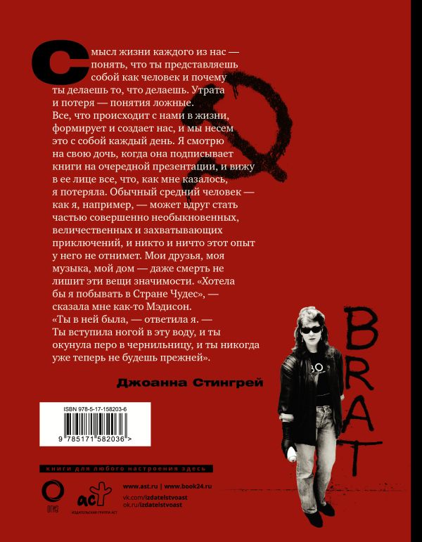 Оставить отзывДве книги воспоминаний Джоанны Стингрей «Стингрей в Стране Чудес» и «Стингрей в Зазеркалье» теперь выходят в одном томе в новом оформлении и с новым предисловием автора, в котором Джоанна рассказывает о приезде в Россию в 2004 и 2018 году, своей дочери Мэдисон, процессе написания своих воспоминаний и многом другом, что волновало ее после возвращения в Америку. Прочитав их, вы узнаете, как все было на самом деле. Эта книга – бесценное свидетельство процесса становления и развития русского рока и арт-андеграунда в самый плодотворный его «золотой» период. Виктор Цой, Юрий Каспарян и Сергей Курёхин, Костя Кинчев и Тимур Новиков, Африка и Коля Васин, Дэвид Боуи и Энди Уорхол и многие-многие другие герои сказочной Страны Чудес.