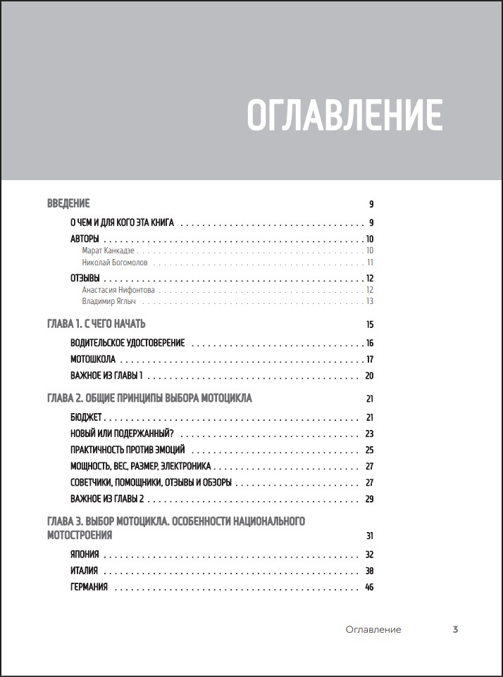 Авторы с многолетним опытом инструкторской, тренерской и журналистской работы ответили на самые важные вопросы: как выбрать мотоцикл, экипировку, научиться ездить, отправиться в путешествие, найти компанию единомышленников, сделать первые шаги в мотоспорте и многие другие.
