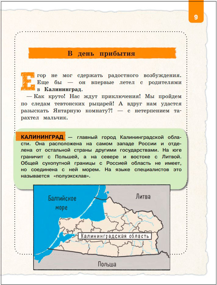 Мальчик Егор и его волшебный помощник кот Мурр станут вашими проводниками в удивительный мир некогда прусских городов Кёнигсберга, Раушена, Кранца, Пиллау и Пальмникена, а ныне российских Калининграда, Светлогорска, Зеленоградска, Балтийска и Янтарного. Вы узнаете их историю, погуляете по старинным улочкам, посетите средневековые замки и кирхи, а также увидите главные природные достопримечательности области – Куршскую косу, Филинскую бухту и Балтийскую косу. Описания достопримечательностей сопровождаются яркими иллюстрациями и фотографиями, что поможет юным читателям лучше представить себе каждое место.