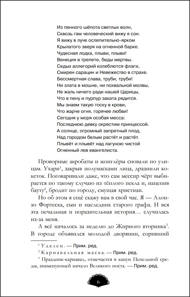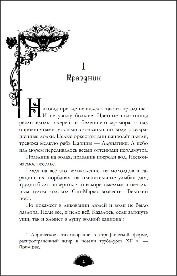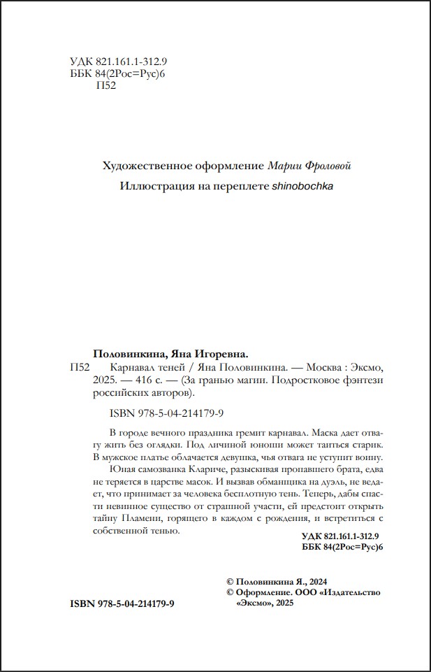 Одиночное подростковое фэнтези, которое напомнит читателям легендарный «Караваль» Стефани Гарбер. Это сказка о любви, времени и сбежавшей тени, навеянная венецианским карнавалом, пьесами Гольдони и Гоцци и театром дель арте. История для тех, кто любит историю, культуру, магию, а также для тех, кто готов взглянуть искушению прямо в лицо.