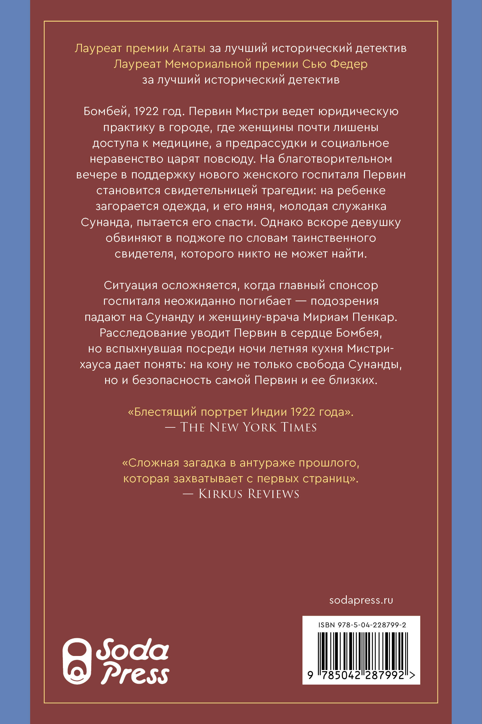 Ситуация осложняется, когда главный спонсор госпиталя неожиданно погибает – подозрения падают на Сунанду и женщину-врача Мириам Пенкар. Расследование уводит Первин в сердце Бомбея, но вспыхнувшая посреди ночи летняя кухня Мистри-хауса дает понять: на кону не только свобода Сунанды, но и безопасность самой Первин и ее близких.