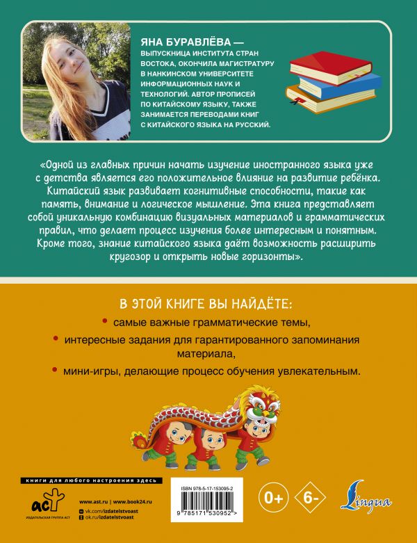 Чтобы добраться до Великой Китайской стены, ребёнку предстоит пройти через сад «Иероглифы», город «Грамматика» и поле «Пунктуация». По дороге он встретит новых друзей, которые помогут ему в этом захватывающем путешествии. Грамматика охватывает все самые необходимые темы для начала изучения китайского языка. В этом необычном пособии ребёнок попробует себя в роли исследователя и детектива, учителя и путешественника. Прекрасное оформление книги и яркие иллюстрации привлекут внимание ученика и помогут не потерять интерес к уроку. Эта книга будет идеальным дополнением к любому учебнику китайского языка, а также может использоваться как основное пособие для занятий китайским языком с детьми!