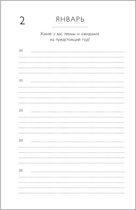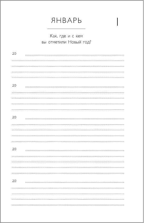 Дневник не привязан к конкретному году и дню недели – начинайте в любой день. Просто найдите сегодняшнее число, укажите год и каждый день заполняйте всего по 3-4 строчки, а когда год закончится, продолжайте вести дневник с первого листа. Таким образом, вы отвечаете на одни и те же вопросы в разные годы и наблюдаете, как меняется ваша жизнь и мысли. Приключение начинается прямо сейчас!