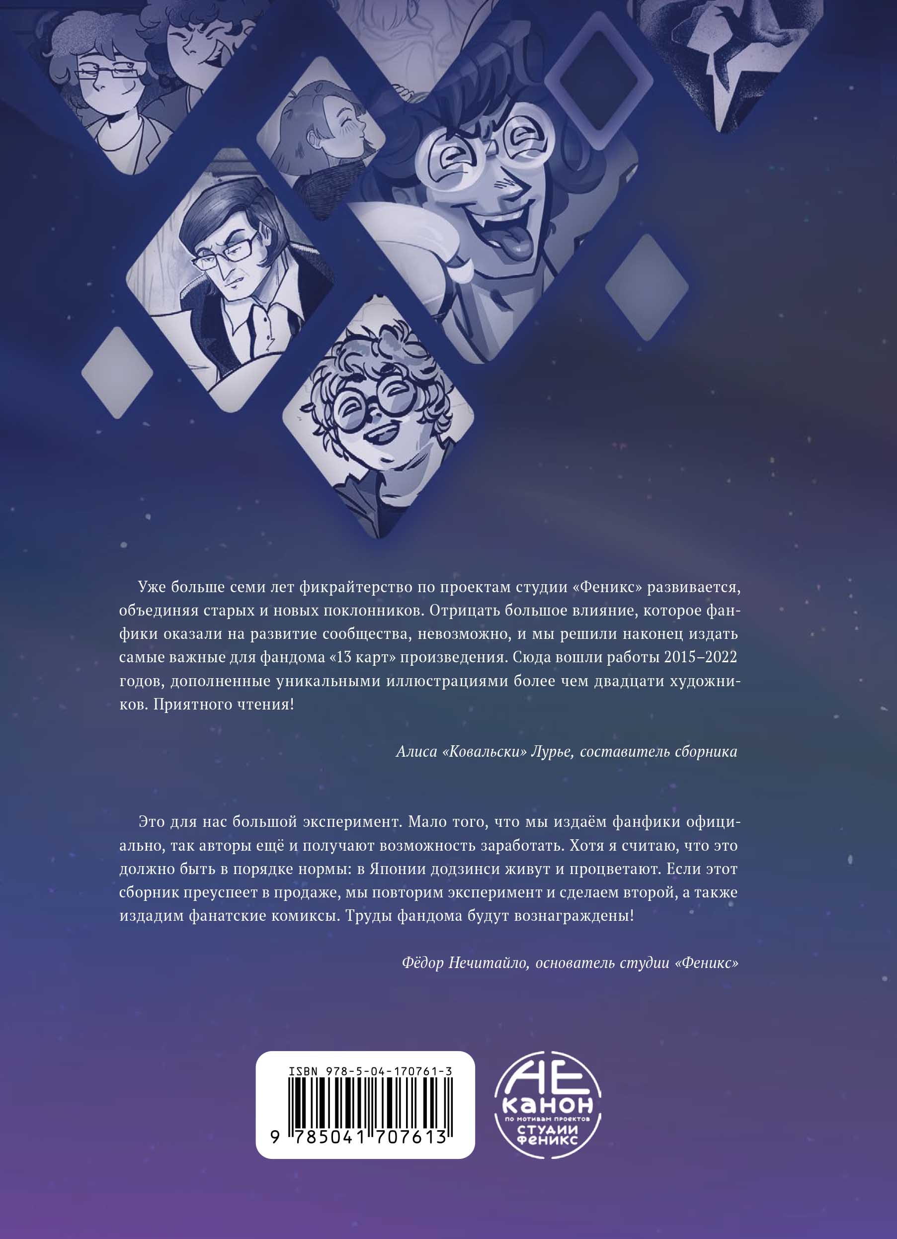 Уже больше семи лет фикрайтерство по проектам студии «Феникс» развивается, объединяя старых и новых поклонников. Отрицать большое влияние, которое фанфики оказали на развитие сообщества, невозможно, и мы решили наконец издать самые важные для фандома «13 карт» произведения. Сюда вошли работы 2015-2022 годов, дополненные уникальными иллюстрациями более чем двадцати художников. Приятного чтения!