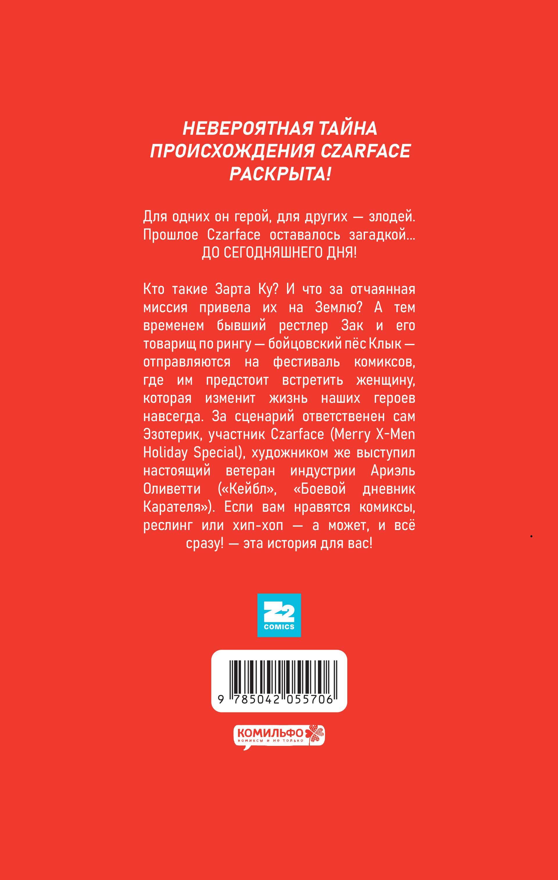 Оставить отзывИ нет, речь не о супергруппе с одноимённым названием, а об их маскоте, антигерое в навороченном костюме. Группа Czarface считается пропавшей без вести, и почти никто не верит в их возвращение. Завесу тайны над её исчезновением и появлением металлического символа раскроет бывший рестлер Зак на пару с псом Клыком. Один фестиваль комиксов перевернёт его жизнь с ног на голову и на кону будет стоять судьба всей планеты!