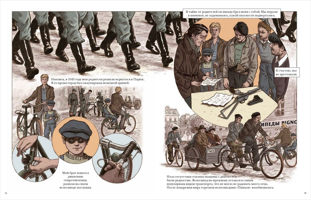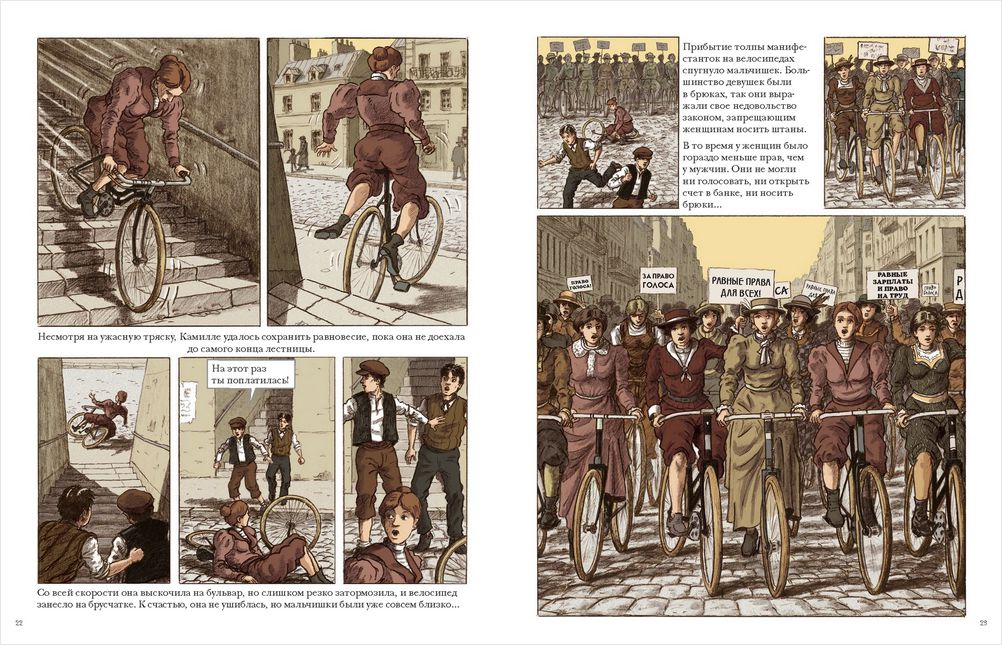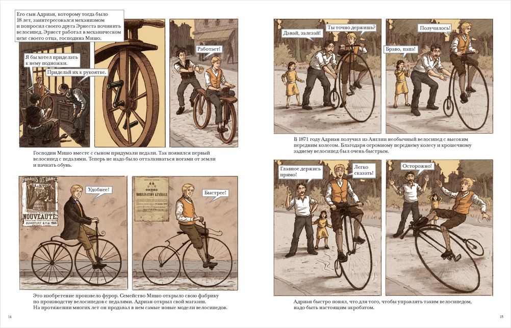 Графический роман На двух колесах: История велосипеда просто и ярко рассказывает об изобретении и развитии велосипеда.