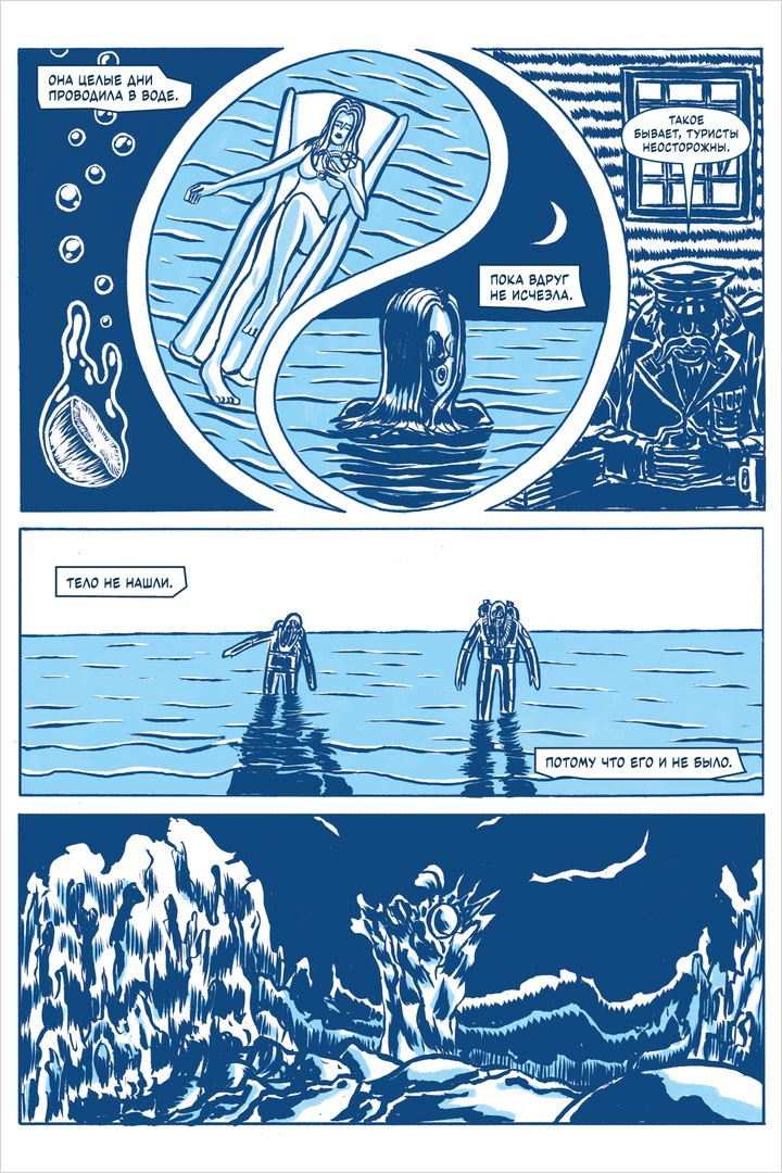 Цунами – кураторская работа автора и переводчика Андрея Лукина («Ниндзя Гаттер», «Диссонанс»). Это сборник небольших графических рассказов-хорроров от звёздных российских комиксистов, который мастерски избегает главной ловушки подобных проектов – визуальной пестроты. «Цунами» не просто объединён темой воды во всех ее формах и агрегатных состояниях (просто взгляните на названия рассказов), но и выполнен в общей цветовой гамме, создающей ощущение того самого бесконечного круговорота воды.
