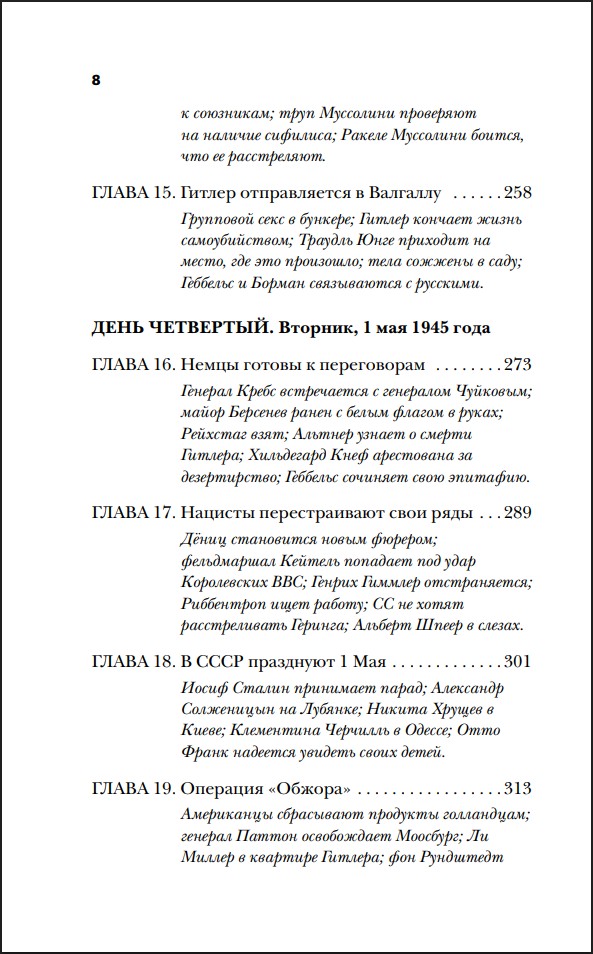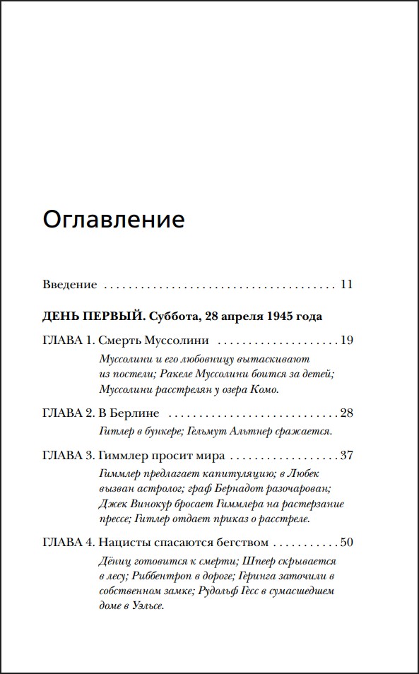 Партизаны поднимают Муссолини с постели любовницы и ведут на казнь. Будущий папа римский Бенедикт пробирается домой и надеется, что его не поймают и не расстреляют свои же немцы за дезертирство. Гитлер готовится к самоубийству, а рядом с ним в бункере под рейхсканцелярией разгорается сексуальная оргия.