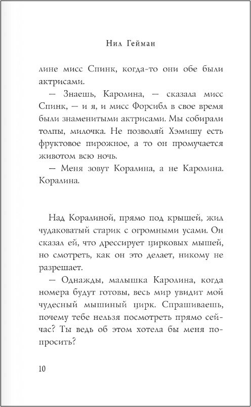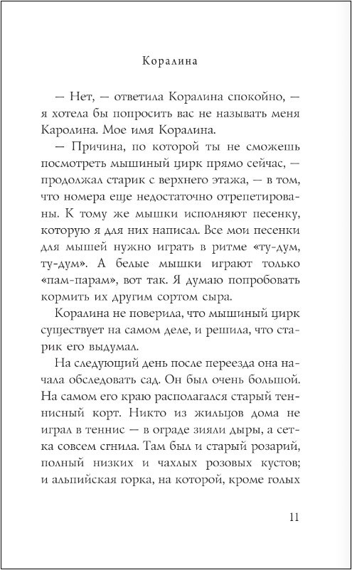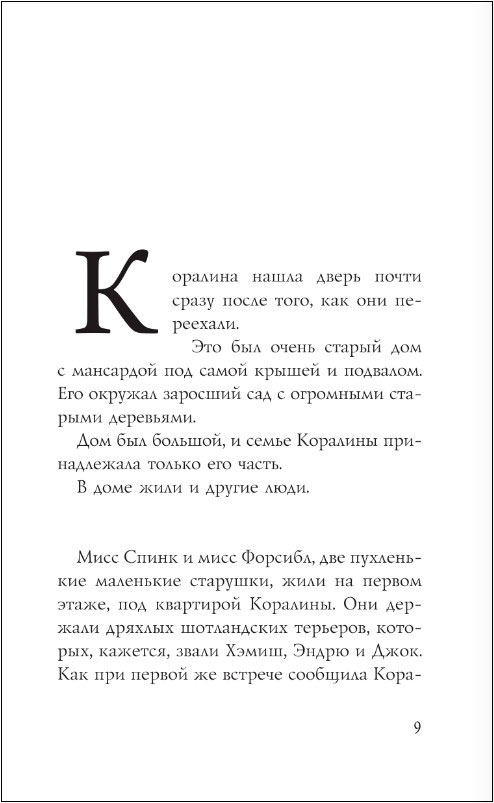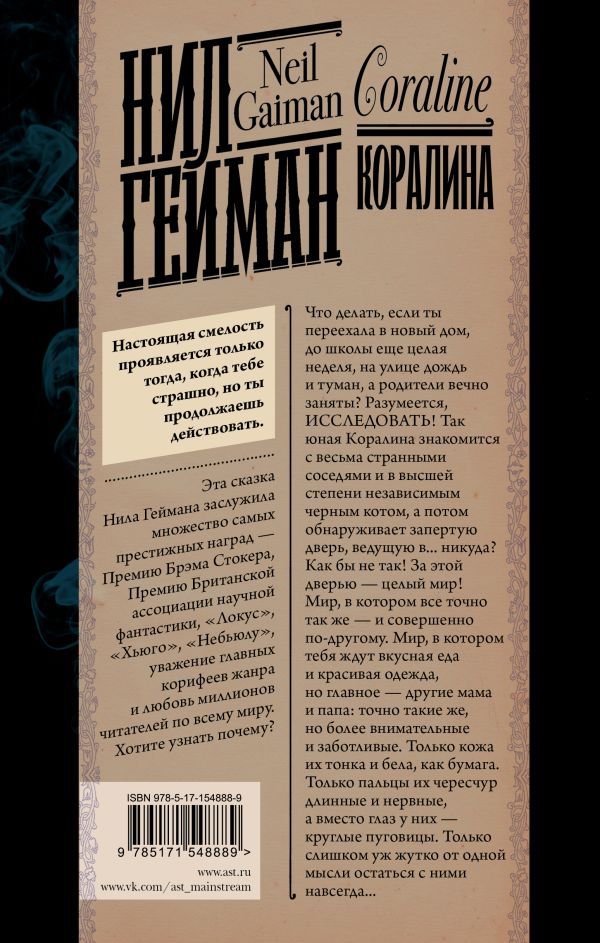 Что делать, если ты переехала в новый дом, до школы еще целая неделя, на улице дождь и туман, а родители вечно заняты? Разумеется, исследовать! Так юная Коралина знакомится с весьма странными соседями и в высшей степени независимым черным котом, а потом обнаруживает запертую дверь, ведущую в… никуда? Как бы не так! За этой дверью – целый мир! Мир, в котором все точно так же – и совершенно по-другому. Мир, в котором тебя ждут вкусная еда и красивая одежда, но главное – другие мама и папа: точно такие же, но более внимательные и заботливые. Только кожа их тонка и бела, как бумага. Только пальцы их чересчур длинные и нервные, а вместо глаз у них – круглые пуговицы. Только слишком уж жутко от одной мысли остаться с ними навсегда…