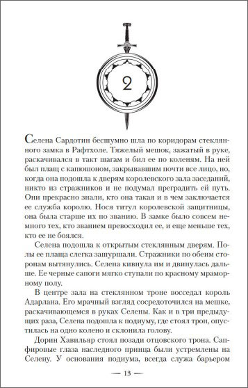 Оставить отзывПобедив в жестком состязании, Селена Сардотин, самая известная женщина-ассасин в Ардаланском королевстве, получает титул королевской защитницы. Эта должность почетная и опасная, ведь душа короля чернее смолы, а его железная рука не знает пощады.