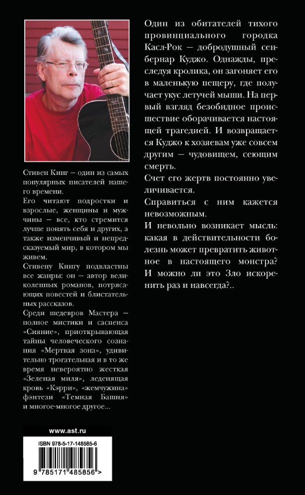 Оставить отзывОдин из обитателей тихого провинциального городка Касл-Рок – добродушный сенбернар Куджо. Однажды преследуя кролика, он загоняет его в маленькую пещеру, где получает укус летучей мыши.