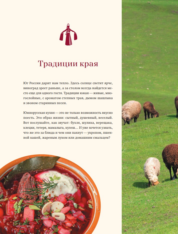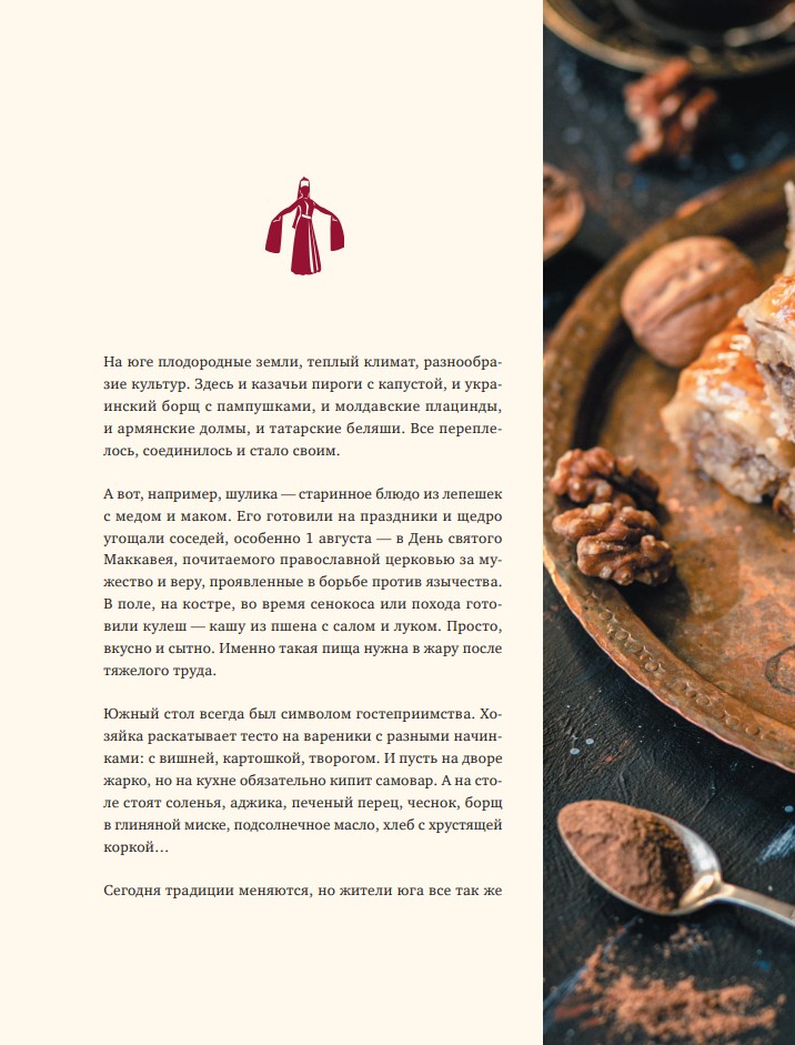 Книга снабжена большим количеством фотографий, передающих неповторимый аромат всей нашей страны, аппетитность ее блюд, широту ее просторов, разнообразие традиций.
