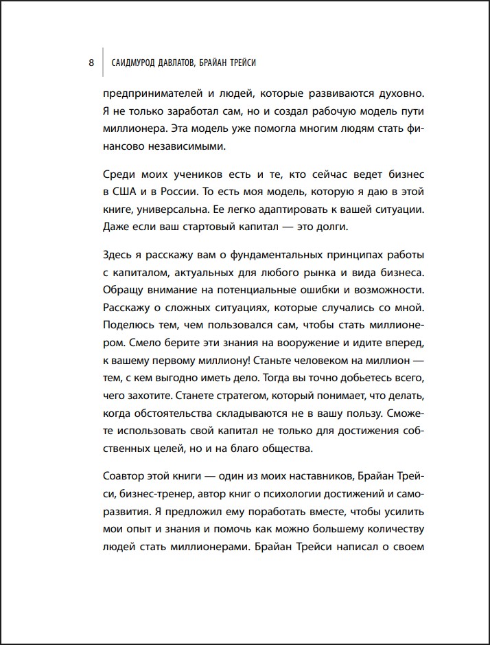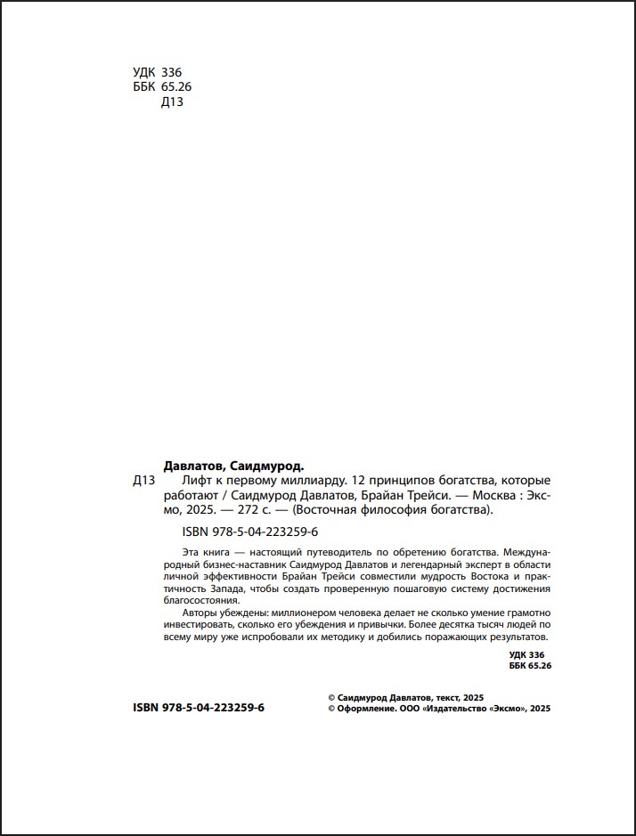 Эта книга – настоящий путеводитель по обретению богатства. Международный бизнес-наставник Саидмурод Давлатов и легендарный эксперт в области личной эффективности Брайан Трейси совместили мудрость Востока и практичность Запада, чтобы создать проверенную пошаговую систему достижения благосостояния.