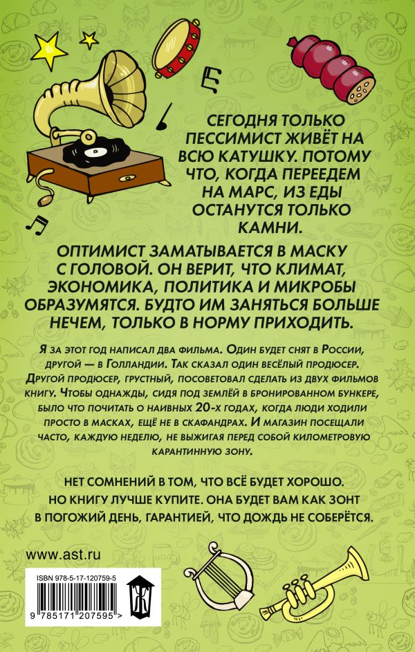 Другой продюсер грустный, посоветовал сделать из двух фильмов книгу. Чтобы однажды, сидя под землёй в бронированном бункере, было что почитать о наивных 20-х годах, когда люди ходили просто в масках, ещё не в скафандрах. И магазин посещали часто, каждую неделю, не выжигая перед собой километровую карантинную зону.