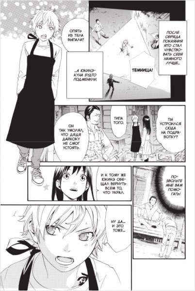 В четвертом томе манги Бездомный Бог после обряда Покаяния вечным ссорам между Ято и Юкинэ пришел конец – теперь они сражаются с призраками вдвойне эффективнее, чем прежде.