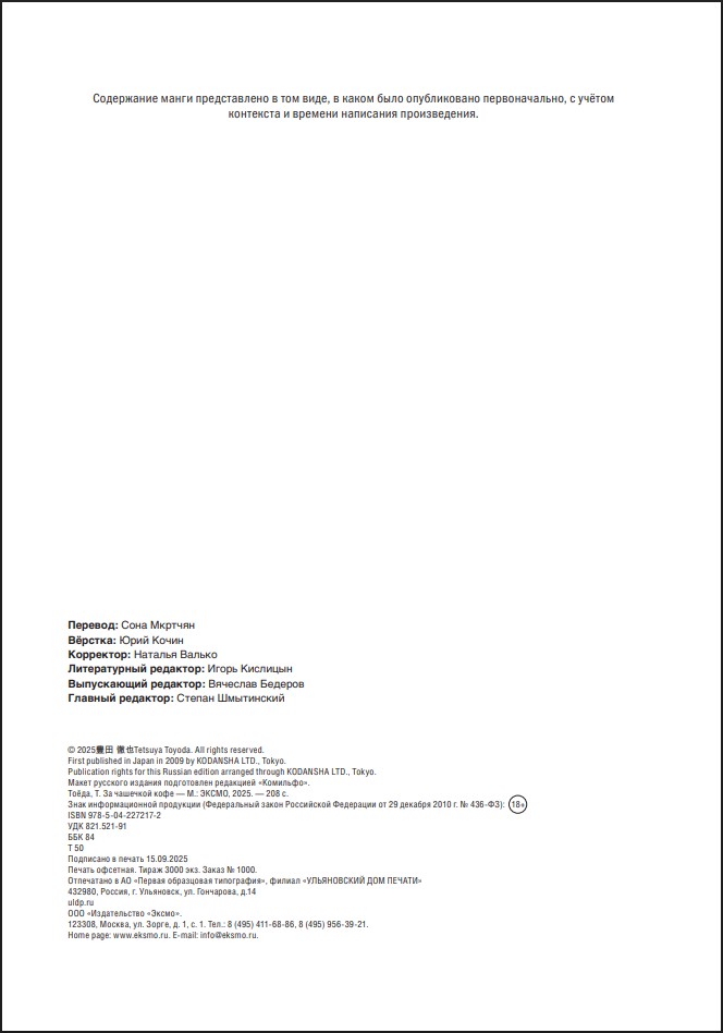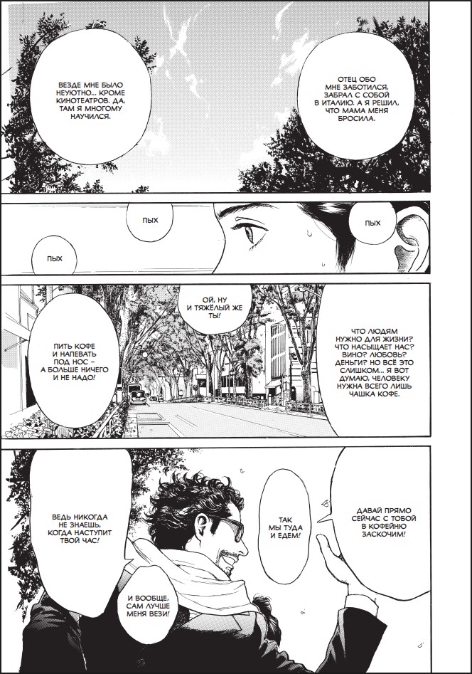 Тэцуя Тоёда (призёр Ангулемского фестиваля) представляет вам сборник зарисовок из жизни и о жизни, вдохновлённый культовым фильмом «Кофе и сигареты» Джима Джармуша.