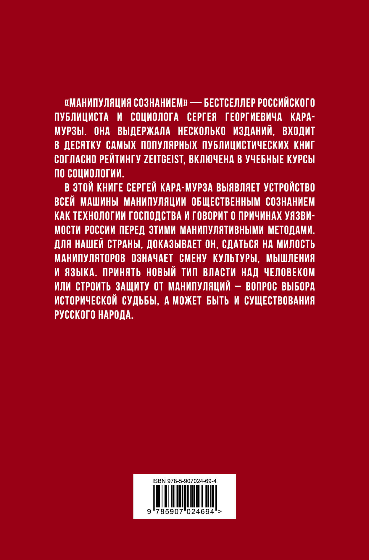 Оставить отзыв«Манипуляция сознанием» – бестселлер российского публициста и социолога Сергея Георгиевича Кара-Мурзы. Она выдержала несколько изданий, входит в десятку самых популярных публицистических книг согласно рейтингу Zeitgeist, включена в учебные курсы по социологии.