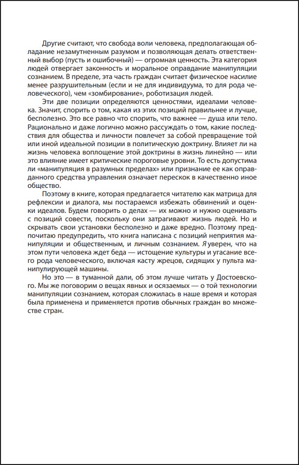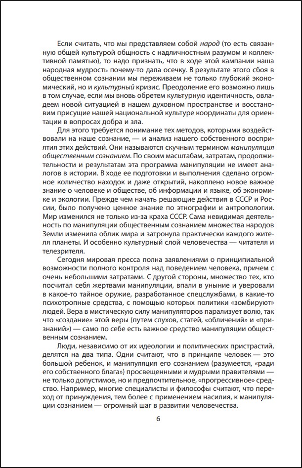 Для нашей страны, доказывает он, сдаться на милость манипуляторов означает смену культуры, мышления и языка. Принять новый тип власти над человеком или строить защиту от манипуляций – вопрос выбора исторической судьбы, а может быть – и существования русского народа.