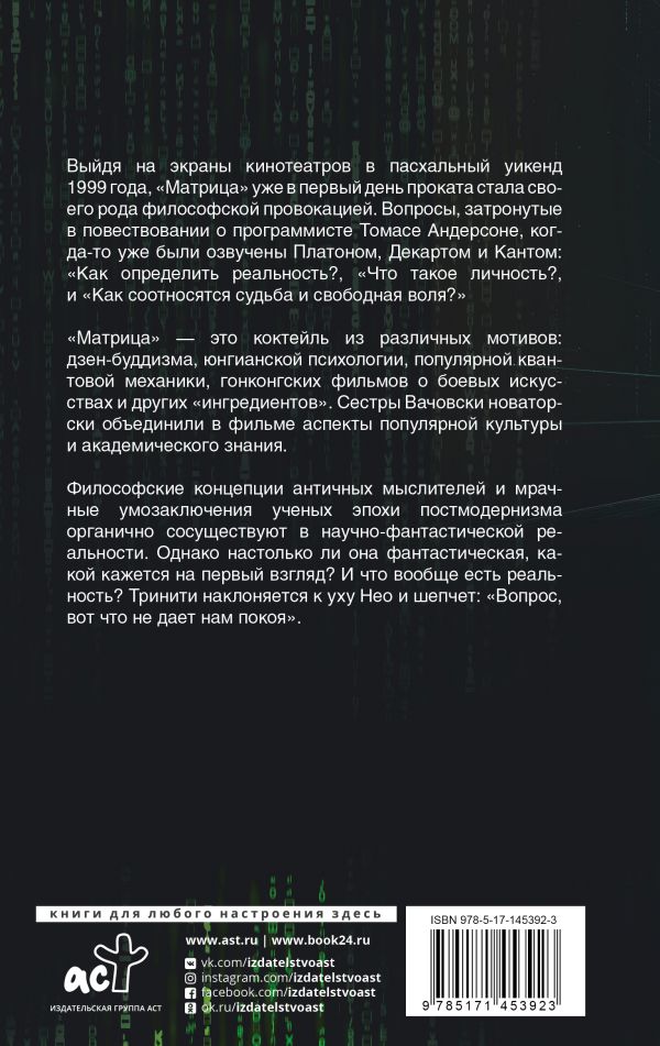 Оставить отзывВыйдя на экраны кинотеатров в пасхальный уикенд 1999 года, «Матрица» уже в первый день проката стала своего рода философской провокацией. Вопросы, затронутые в повествовании о программисте Томасе Андерсоне, когда-то уже были озвучены Платоном, Декартом и Кантом: «Как определить реальность?» «Что такое личность?» и «Как соотносятся судьба и свободная воля?»