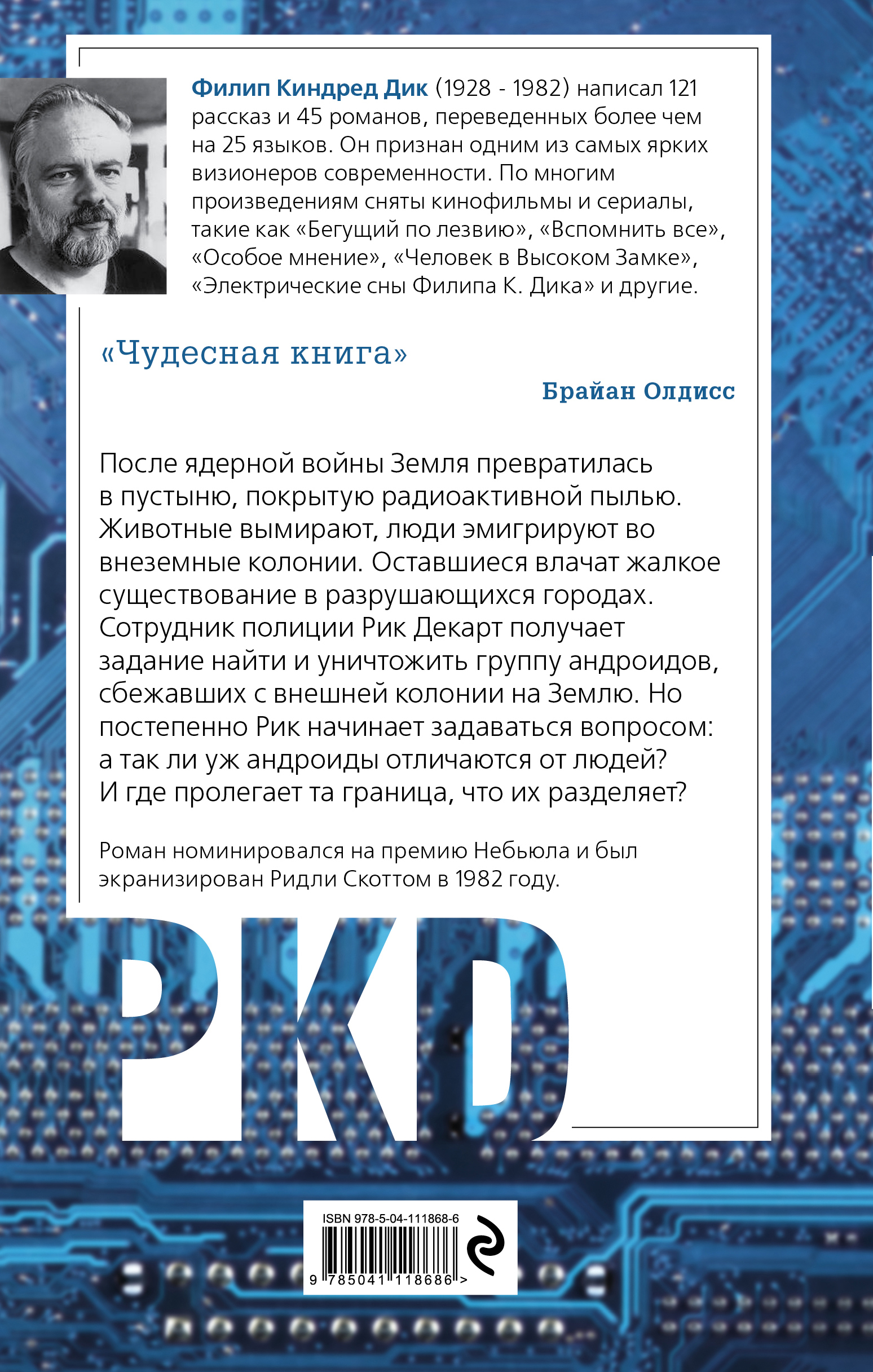 Филип Киндред Дик (1928 – 1982) написал 121 рассказ и 45 романов, переведенных более чем на 25 языков. Он признан одним из самых ярких визионеров современности. По многим произведениям сняты кинофильмы и сериалы, такие как «Бегущий по лезвию», «Вспомнить всё», «Особое мнение», «Человек в Высоком Замке», «Электрические сны Филипа К. Дика» и другие.