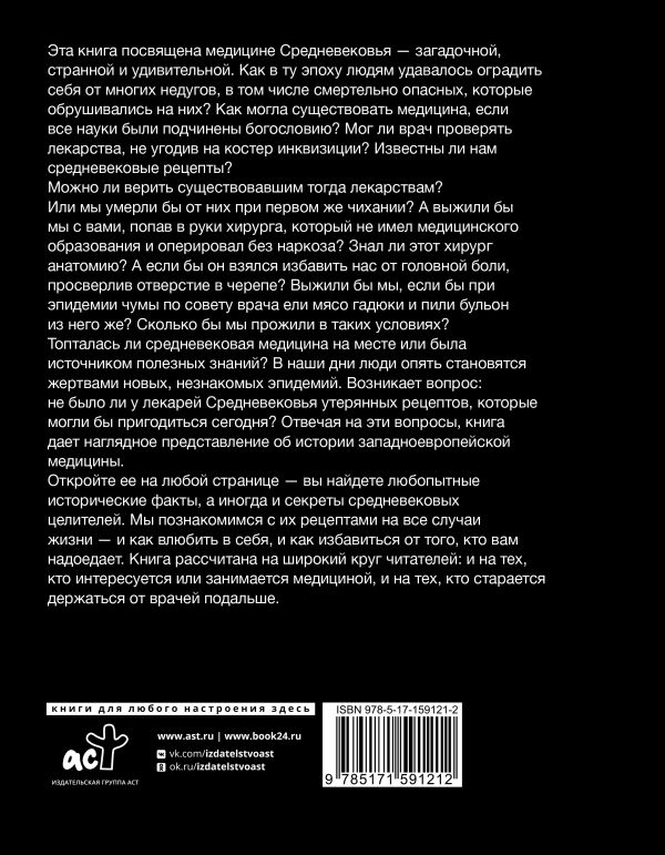 Эта книга посвящена медицине Средневековья – загадочной, странной и удивительной. Как в ту эпоху людям удавалось оградить себя от многих недугов, в то числе смертельно опасных, которые обрушивались на них? Как могла существоват медицина, если все науки были подчинены богословию? Мог ли врач проверять лекарства, не угодив на костер инквизиции? Известны ли нам средневековые рецепты? Можно ли верить существовавшим тогда лекарствам? Или мы умерли бы от них при первом же чихании? А выжили бы мы с вами, попав в руки хирурга, который не имел медицинского образования и оперировал без наркоза? Знал ли этот хирург анатомию? А если бы он взялся избавить нас от головной боли, просверлив отверстие в черепе? Выжили бы мы, если бы при эпидемии чумы по совету врача ели мясо гадюки и пили бульон из него же? Сколько бы мы прожили в таких условиях? Топталась ли средневековая медицина на месте или была источником полезных знаний? В наши дни люди опять становятся жертвами новых, незнакомых эпидемий.
