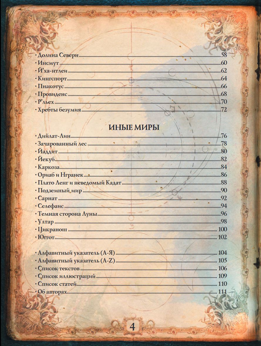 Неведомый Кадат и Юггот, Аркхем и Данвич, Инсмут и Провиденс, Хребты Безумия и Р’льех, Серебряный Ключ и тиара Глубоководных, «Культы гулей», «Король в желтом» и, конечно же, «Некрономикон» – обо всем этом и многом другом, с указанием названий, имен, произведений и авторов. Для всех, кто интересуется Мифами Ктулху и дерзает погрузиться в пучины Космического Ужаса глубже, чем когда-либо!