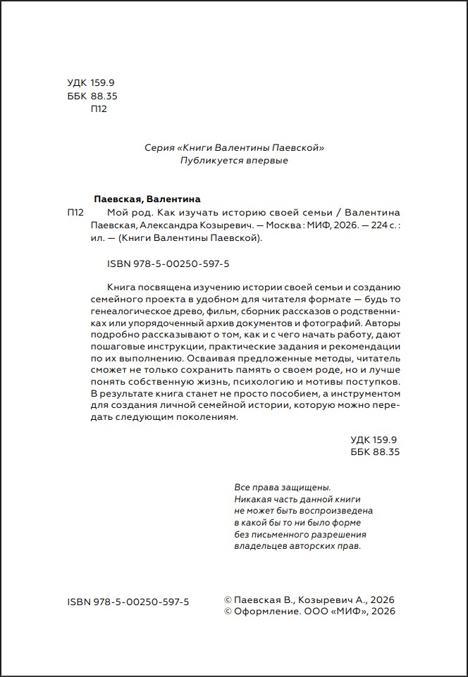 Практическое руководство по изучению истории своей семьи от Валентины Паевской и Александры Козыревич. В книге собраны пошаговые инструкции и советы, которые помогут найти сведения о предках, работать с архивами, упорядочить фотографии и документы, создать генеалогическое древо или семейную книгу.