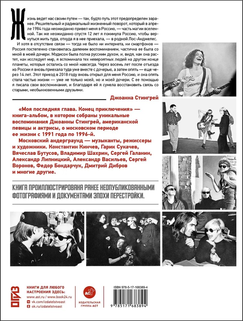 Оставить отзыв«Моя последняя глава: Конец приключения – книга-альбом, в котором собраны уникальные воспоминания Джоанны Стингрей, американской певицы и актрисы, о московском периоде ее жизни с 1991 года по 1996-й.