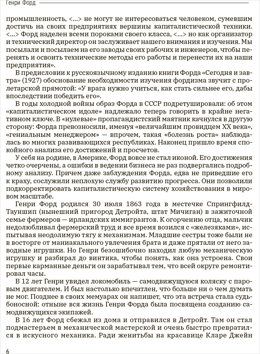 Генри Форд – личность поистине масштабная и противоречивая: один из богатейших людей своего времени, изобретатель-самоучка, безжалостный эксплуататор, страстный идеалист, консервативный новатор, прагматичный делец и оригинальный мыслитель. Эхо его великих достижений и оглушительных неудач раскатисто отозвалось в судьбе целых государств и отраслей промышленности по всему миру.