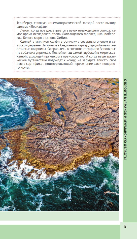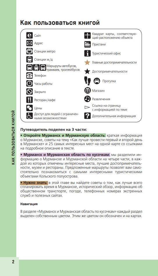 В путеводителе вы найдете описания самых интересных мест в Мурманске, Териберке, Кировске и окрестностях, а сориентироваться на местности помогут готовые маршруты и карты, расположенные на страницах гида.