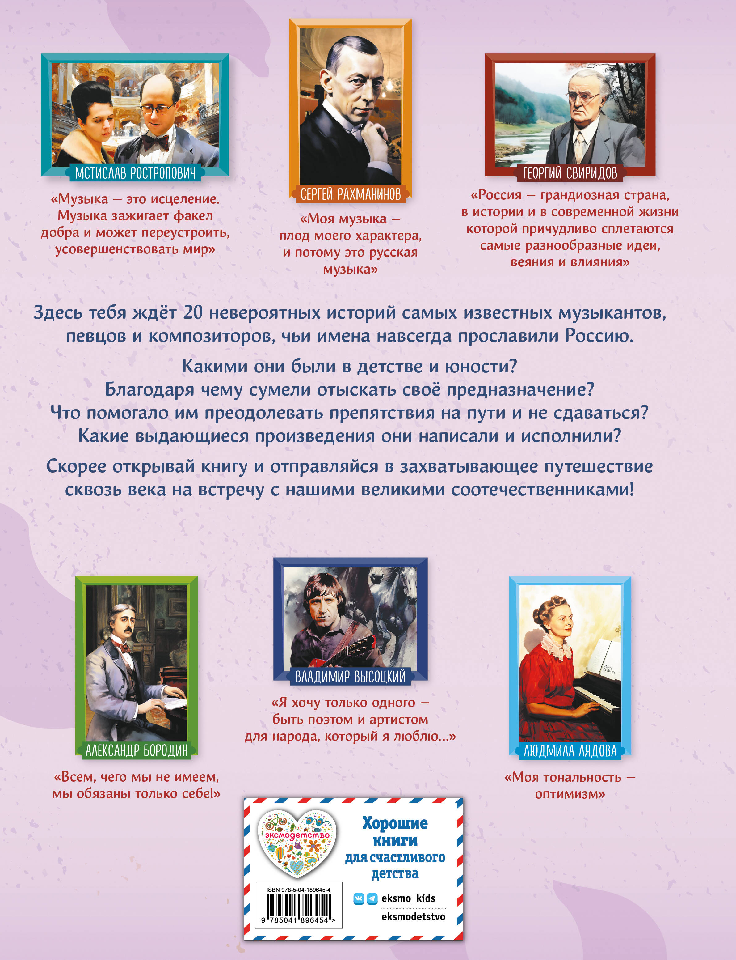 Эта книга патриотической серии «Великие люди великой страны» рассказывает о двадцати наших знаменитых соотечественниках – музыкантах, композиторах, музыковедах, певцах, чьи имена навсегда останутся в истории России. Кого называют «золотым голосом России»?...
